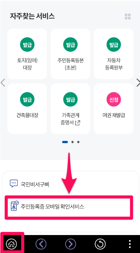 정부24 모바일신분증 발급하기 위해 정부24 어플을 설치하고 로그인을 해야합니다. 간편인증 등을 통하여 로그인을 하고 홈화면에서 내려오다보면 '주민등록증 모바일 확인서비스' 선택하고 약관동의를 합니다.