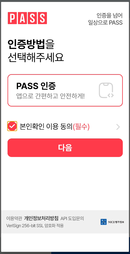 이후 본인인증을 다시한번더 하게되는데 휴대폰본인인증이 문자로는 되지않고 패스앱으로만 가능하게 되어있습니다.