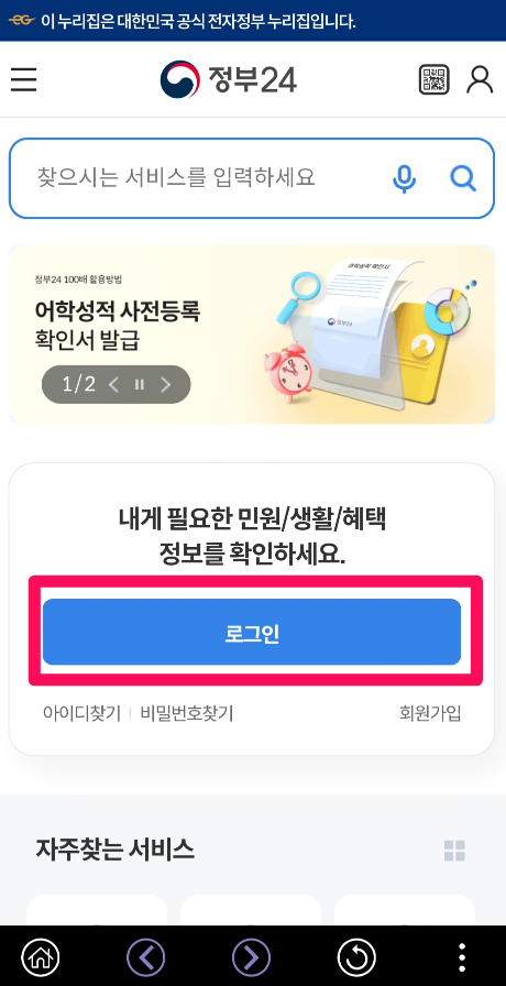 정부24 모바일신분증 발급하기 위해 정부24 어플을 설치하고 로그인을 해야합니다. 간편인증 등을 통하여 로그인을 하고 홈화면에서 내려오다보면 '주민등록증 모바일 확인서비스' 선택하고 약관동의를 합니다.