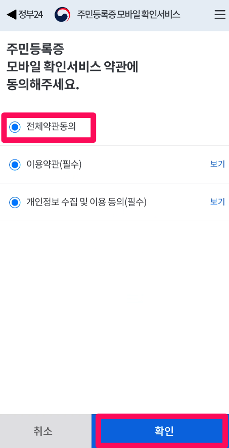 패스앱 PASS앱 모바일신분증 발급하기 주민등록증 모바일 확인서비스 가입을 선택하고 약관 전체동의를 누른 뒤 하단의 동의하기를 선택합니다.
